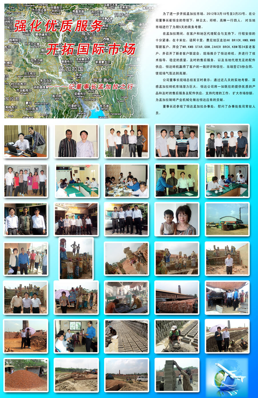 在孟加拉期間,公司得到了當(dāng)?shù)卮砩痰亩αχС郑匍_了新老客戶聯(lián)誼會,對當(dāng)?shù)厥袌龅拇u瓦行情進行深入交流。當(dāng)前孟加拉多半還是手工制磚,而且國家已經(jīng)出臺了政策,截至2015年取消手工做磚。這對于公司來說是個很大的機遇。但同時,競爭也是激烈的,各個磚機廠紛紛涌入孟加拉市場,加強對當(dāng)?shù)厥袌龅拈_發(fā),可以說機遇與挑戰(zhàn)并存的,這就要求公司要嚴(yán)抓產(chǎn)品質(zhì)量,加強售后服務(wù),爭取使我們的機器遍布孟加拉市場。