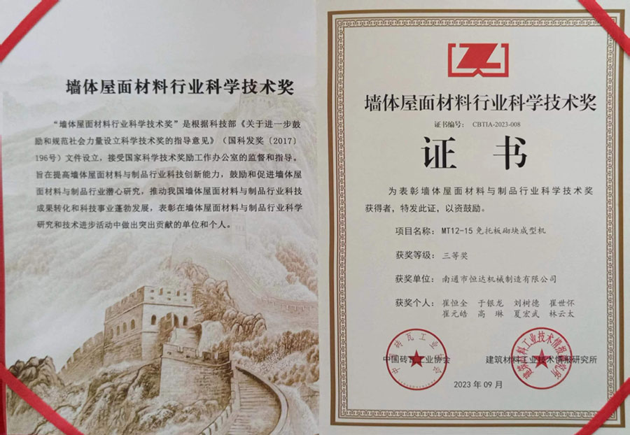 南通市恒達(dá)機(jī)械制造有限公司獲得墻體屋面材料行業(yè)科學(xué)技術(shù)三等獎。
